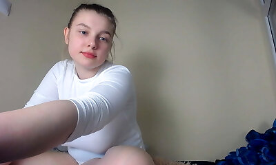 Sweet solo teen in white stockings frigs her tight pussy