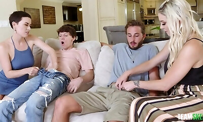 две сексуальные блондинки с пухлыми попками меняют своих парней, чтобы насладиться гонзо вчетвером