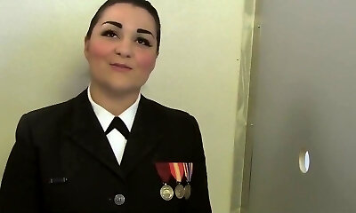 海军Damsel MORENA得到双重面部射液在GLORYHOLE