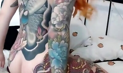 killer tattooed redhead proudly shows pierced tits