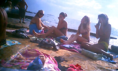 вспышка члена в трусиках для группы девушек на пляже